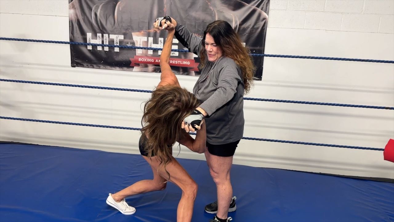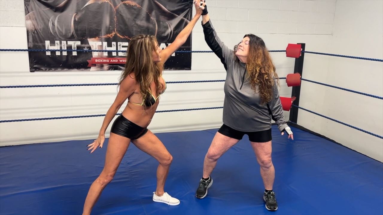 The Bruiser (played by Stacy Burke) is looking for the The Villainess (played by Jewell Marceau). The Bruiser (wearing her trademark blue thong one piece with black tights and black boots) has entered the lair of the Villainess and begins her search. The Villainess (dressed in black leather and fishnets) attacks as the heroine opens a door. The two combatants trade punches to the stomach, but the Bruiser appears helpless as the vile Villainess has harnessed the powers of all her victims and appears invincible! The poor Bruiser struggles and struggles to win, but it is pointless as she is subjected to leg scissors, headlocks, breast mauling, hair pulling, belly and breast punches, crotch mauling, wedgies, the rocking horse, and much, much more. Does the Bruiser recover or does she become yet another victim of the Villainess?