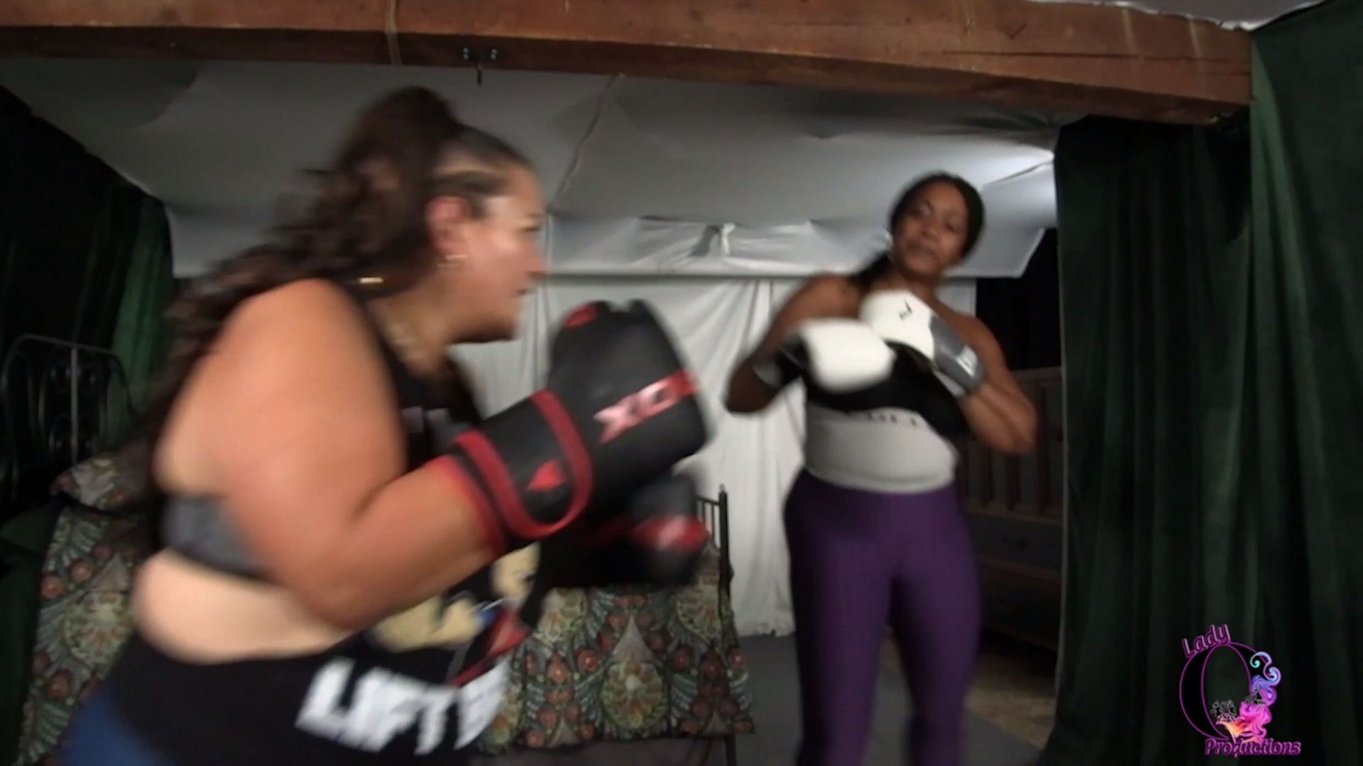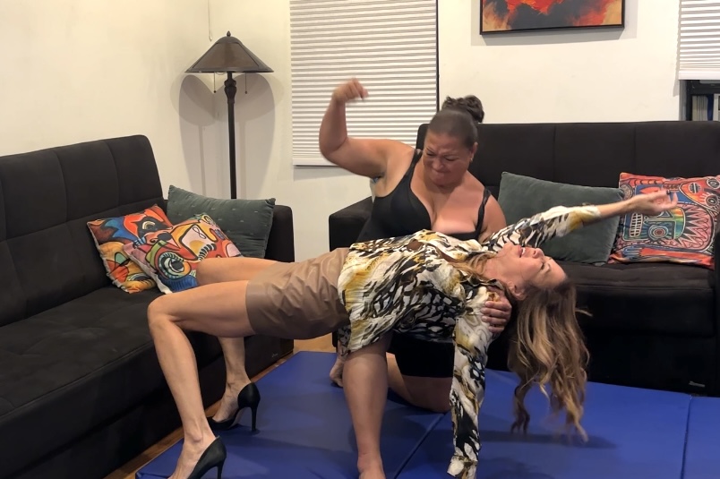 The Bruiser (played by Stacy Burke) is looking for the The Villainess (played by Jewell Marceau). The Bruiser (wearing her trademark blue thong one piece with black tights and black boots) has entered the lair of the Villainess and begins her search. The Villainess (dressed in black leather and fishnets) attacks as the heroine opens a door. The two combatants trade punches to the stomach, but the Bruiser appears helpless as the vile Villainess has harnessed the powers of all her victims and appears invincible! The poor Bruiser struggles and struggles to win, but it is pointless as she is subjected to leg scissors, headlocks, breast mauling, hair pulling, belly and breast punches, crotch mauling, wedgies, the rocking horse, and much, much more. Does the Bruiser recover or does she become yet another victim of the Villainess?