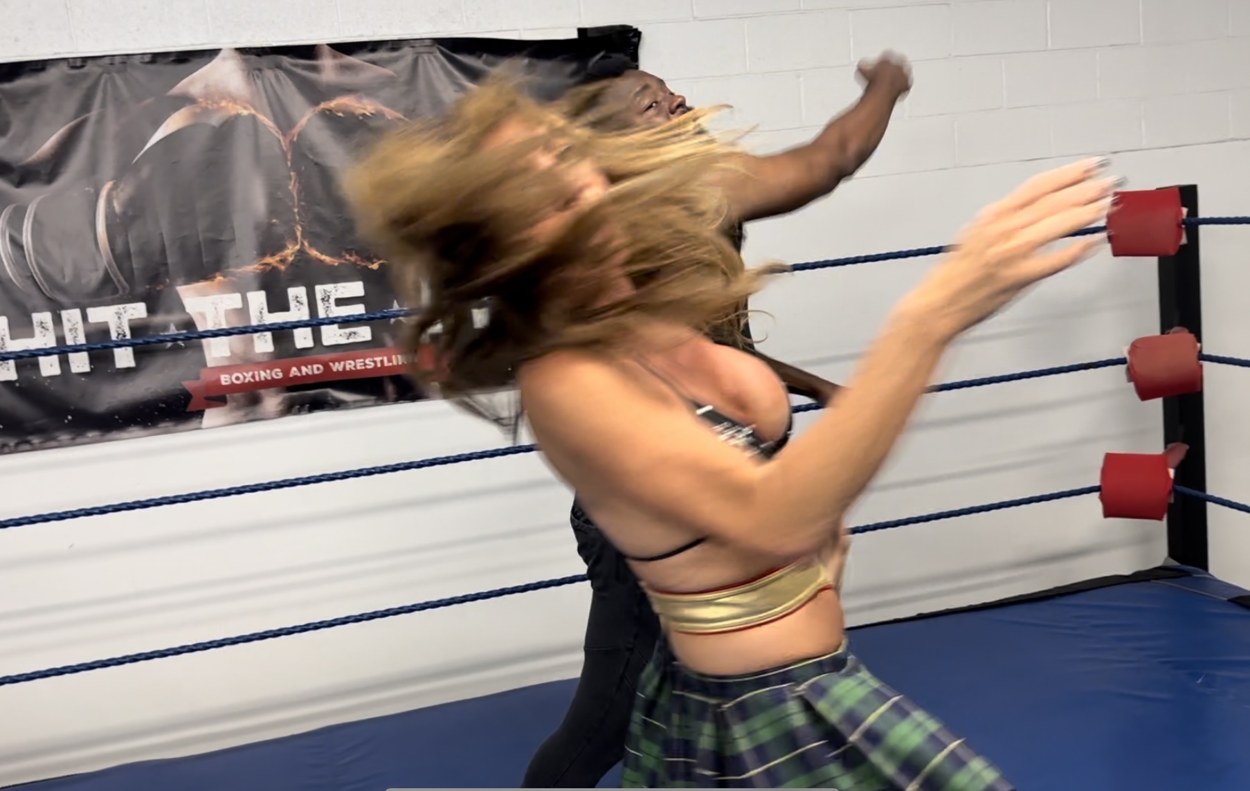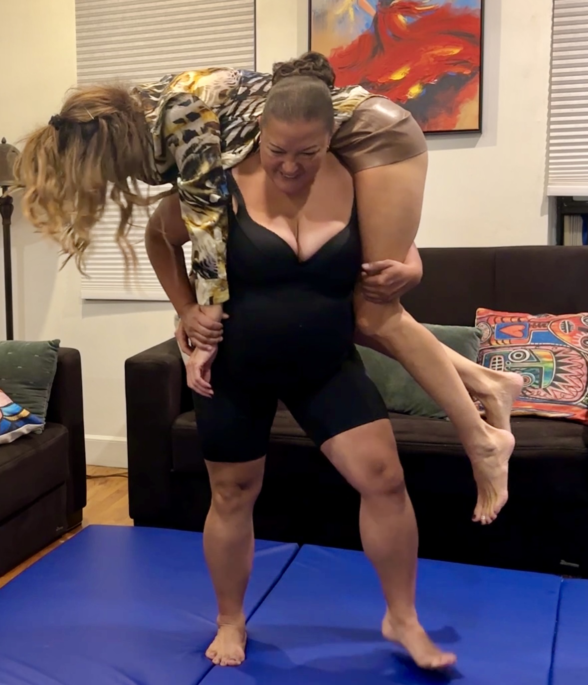 The Bruiser (played by Stacy Burke) is looking for the The Villainess (played by Jewell Marceau). The Bruiser (wearing her trademark blue thong one piece with black tights and black boots) has entered the lair of the Villainess and begins her search. The Villainess (dressed in black leather and fishnets) attacks as the heroine opens a door. The two combatants trade punches to the stomach, but the Bruiser appears helpless as the vile Villainess has harnessed the powers of all her victims and appears invincible! The poor Bruiser struggles and struggles to win, but it is pointless as she is subjected to leg scissors, headlocks, breast mauling, hair pulling, belly and breast punches, crotch mauling, wedgies, the rocking horse, and much, much more. Does the Bruiser recover or does she become yet another victim of the Villainess?